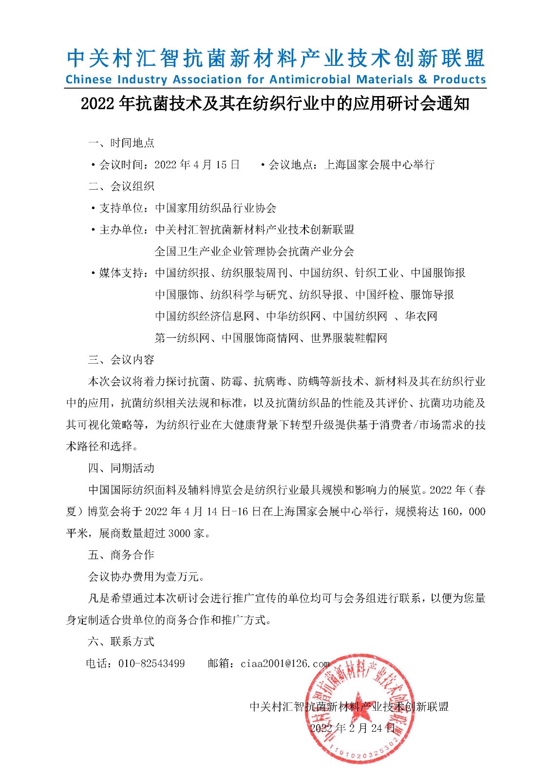 一、时间地点·会议时间:2022年3月10日·会议地点:上海二、会议组织·支持单位:中国家用纺织品行业协会·主办单位:中关村汇智抗菌新材